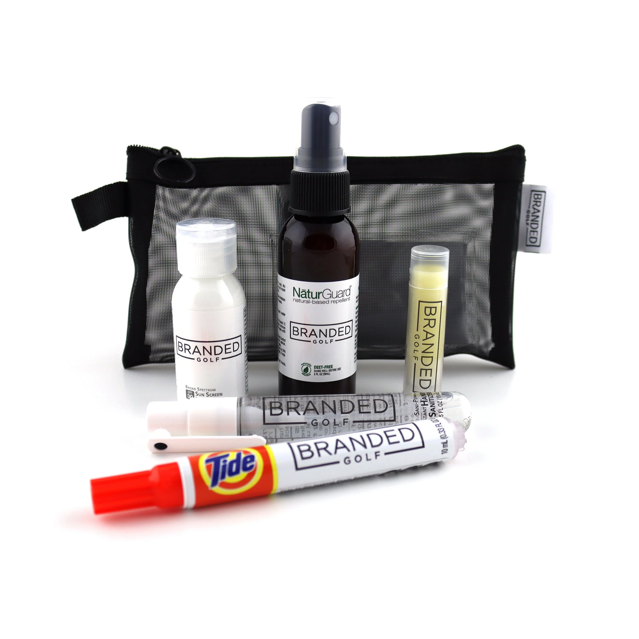 Keep your golfers prepared from the first tee to the clubhouse with our Course-to-Clubhouse Golf Wellness Kit—a thoughtful, practical giveaway that showcases your course’s brand. Packed in a sleek black mesh zipper bag with a sewn-in logo tag and carabiner, this kit includes six must-have items: a Tide to Go Pen, Sani-Pen Hand Sanitizer Spray, NaturGuard DEET-free Insect Repellent, SPF 30 Sunscreen, SPF 15 Vanilla Beeswax Lip Balm, and a premium 4x7 microfiber cloth. Making this a smart and stylish addition to your pro shop, tournaments, or welcome gifts.